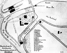 After arriving at the camp, the prisoners were selected: those capable of working, aged 14 to 60, were taken to forced labor, the sick, the elderly and women with children were detained in the camp. The prisoners lived in three unheated factory warehouses, in a brick shed and in a barn together with the cattle. They slept on a concrete floor. Babies were given a cup of skim milk once a week.[10] Extremely hard work was a daily task: in particular, prisoners took over the rebuilding of the water dam destroyed by retreating Poles.[11] With the camp located on both sides of the Brda River, the exhausted prisoners had to travel about a kilometer in order to get to the canteen.[12]