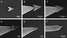 Sequential electron micrographs showing the process of capping a gold needle with a CBH carbon nanocone (top left)[9]