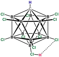 11) was shown to be monomeric in the gas phase, with the acidic proton (shown in red) bound to Cl(12) and secondarily bonded to Cl(7). The monomeric form is metastable when condensed, but eventually polymerizes to give a structure with the acid proton bridging between carborane units.[10] (N.B.: The lines between the carbon and boron atoms of the carborane core show connectivity but should not be interpreted to be single bonds. The bond orders are less than one, due to electron deficiency.)