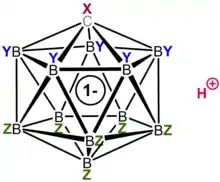 - ↑ Note that the image the acidic proton is not the one bonded to the carborane but that it is the counterion not displayed.