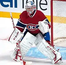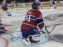 Like many modern goaltenders, Price uses the "butterfly hybrid" technique, a mix of "stand-up" and "butterfly style" goaltending. Using this style, Price will stay on his feet for high shots, and drop to his knees, pointing his skates outwards with his pads covering the bottom width of the net. Price has been lauded by his teammates and opponents alike for his exceptionally calm demeanor on the ice, with 2014 Olympic teammate and Los Angeles Kings defenseman Drew Doughty calling Price "probably the calmest goalie [he] played in front of".[68] Price’s methodical and calm approach to the play often allows him to make difficult saves look mundane and routine.[68] Price is considered by the Canadiens' management and coaches to be one of the leaders of the team and is present during meetings with the team's captain and alternate captains.[69]