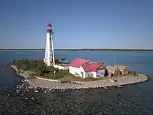 A dangerous reef stretches 1 mile (1.6 km) along the north and west shores of Caribou Island, and a shallow reef 2.5 miles (4.0 km) stretches beyond to the southwest to Caribou Island, lying only 11 feet (3.4 m) below the lake's surface. The unmanned lighthouse, which is owned by the Canadian Coast Guard, is located on a tiny adjacent island called Lighthouse Island a few hundred feet across and positioned 1 mile (1.6 km) west of the southern tip of the main island. When originally built, it was visible for 16 miles (26 km) and operated on a 30-second revolving cycle.[4] Caribou Island is about 55 km (34 mi) off Agawa Bay on the east shore of the lake.