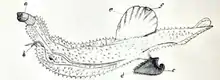 A drawing of Carinaria lamarcki; a) proboscis b) tentacles c) shell d) gills e) foot f) sucker