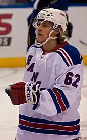 Hagelin was then selected in the sixth round, 168th overall, by the New York Rangers at the 2007 NHL Entry Draft.[10][11] Before playing at Michigan, Hagelin wore the number 26, but when that number was already taken by fellow forward Danny Fardig, Hagelin changed to 12. Hagelin later then chose to wear the number 62 with the Rangers because both 12 and 26 were already taken, so he switched the digits of his old 26, thus wearing 62.[12] Hagelin played in the 2008 World Junior Ice Hockey Championships with Sweden, winning silver.