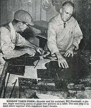 From the studio's launch in 1942 to Carl Huneke's death in 1972, Century Stained Glass Studio created, installed and maintained stained glass windows in churches, chapels, convents, schools, hotels and hospitals.[1][2][3][10][11][12][13][14][15][16][17][18][4][9]