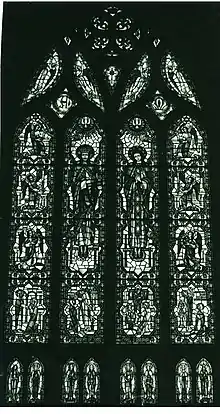 The nearly complete stained glass window was set by rubbing putty on both sides to make it firm and watertight.[6][7][22]