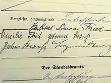Due to his Jewish origins Carl Fried, just like Bresslau-Hoff, had difficulties associating with some German Brazilians in Brazil.[43] Nazi enthusiasts were initially found among them. Carl Fried found a new homeland and reestablished Schlaraffia Paulista a part of a worldwide men's union with cultural ambitions originally founded by artists in Prague.[50] Carl, Emilie Gertrud (Trude) and their two sons Rainer and Robert are no longer alive. Rainer Fried became a Professor of Biochemistry in the United States and served as the chairman of the local chapter of Amnesty International."[13]