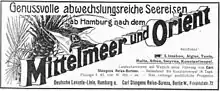 Due to the conveniently located port of departure in Trieste, Stangen often used Österreichischer Lloyd, whose Berlin agency he also acted as, for Orient voyages and chartered the SS Bohemia from them.[2] Due to this business connection, he was also able to offer Orient trips in October 1898, during which the participants, most of whom came from Protestant church circles, were able to take part in the Wilhelm II's voyage to the Levant in 1898, which the German Emperor carried out on 31 October 1898 as part of his Wilhelm II's voyage to the Levant in 1898 (so-called festive trip) could take part in the opening of the Church of the Redeemer, Jerusalem. For this purpose, he again chartered the SS Bohemia from the ÖL (see postcard to a participant shown opposite) and, due to the great demand, also the SS Thalia. For this voyage Carl Stangen had specially advertised in the Kreuzzeitung from 31 July 1898 (No. 353, supplement).[3]