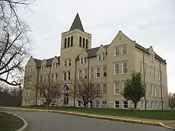 Carnegie Hall of Moores Hill College, also known as Moores Hill High School, is a historic educational building located at Moores Hill, Dearborn County, Indiana. It was built in 1907, and is a 2+1⁄2-story, "T"-plan, brick building with Collegiate Gothic and Jacobethan Revival style design elements. It sits on a raised limestone faced basement. The building consists of a central portion flanked by projecting wings bisected by a central bell tower with pyramidal roof. It features a steeply pitched gable roof, parapeted gables, terra cotta trim, and pointed arch openings. The building housed Moores Hill College until 1917, when it moved to Evansville to later become the University of Evansville. It was funded in part by Andrew Carnegie, who donated $18,750 to its construction. It later housed the local high school and elementary school until 1987.[2]: 5–6, 10