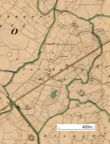 An 1842 map notes that the church was in ruins and shows it in the northern part of Noughaval townland, about 200 metres (660 ft) from the main road running through the townland, now the L-4114 local road. The map shows a burial ground for children beside the ruined church.[4]