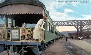 By 1954 the train's North Carolina route east from Asheville ended at Greensboro.[10] By 1954 the South Carolina branch no longer went to Charleston; rather, it ended at Columbia.[11] By 1966 the train lost its dining car, which in the early 1960s had been downgraded to a dinette.[12] The Southern Railway discontinued the Carolina Special on December 5, 1968, which had by then dwindled to a coach-only remnant.[13][14] In final years, all that remained was a remnant of the "Asheville Special" was a three day a week train, Southern Railway #3/#4, between Asheville and Salisbury.[15] The discontinuing of this unnamed remnant on August 8, 1975 was the last regularly scheduled passenger service for Asheville. Most of the line between Charleston and Aiken, South Carolina, has been lifted as there was little freight traffic generated by the historic but redundant route to justify its continued operation.