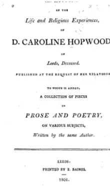 D. Caroline Hopwood born D. Caroline Skene (1700s – 1801 at the latest) was a British autobiographer and schoolmistress of Leeds.