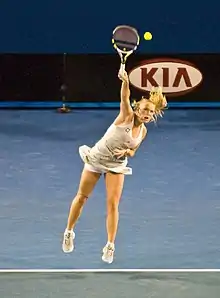 During the off season, Wozniacki switched her racquet make from Babolat to Yonex.[45] She began her 2011 season with an exhibition match in Thailand against Kim Clijsters where she lost in a super tie-break.[46] Wozniacki then played another exhibition, the team Hong Kong Tennis Classic, where she represented and was captain of Team Europe. She won two matches against Team Asia Pacific, then was crushed by world No. 2, Vera Zvonareva, in the final against Team Russia.[47] Her first WTA tournament was the Sydney International. She received a bye into the second round, where she lost to Dominika Cibulková.