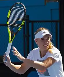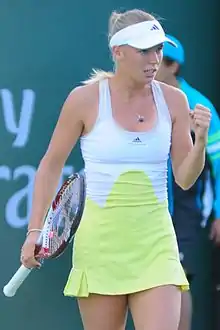 Known for her footwork and defensive abilities, Wozniacki won 30 WTA Tour singles titles (including six in both 2010 and 2011, the most in a year by a WTA player from 2008–2011)[6] and two doubles titles. A junior major champion, she won the 2006 Wimbledon girls' singles title over Magdaléna Rybáriková and was voted the WTA Newcomer of the Year in 2008. Before her victory at the 2018 Australian Open over Simona Halep, she had reached two major finals at the US Open, falling to Kim Clijsters in 2009 and to Serena Williams in 2014. Wozniacki also won the season-ending WTA Finals in 2017, beating Venus Williams, after previously finishing runner-up to Clijsters at the event in 2010. Other career highlights include winning three Premier Mandatory and three Premier 5 titles, reaching four major semifinals (the 2011 Australian Open and the 2010, 2011 and 2016 US Opens), three major quarterfinals (the 2012 Australian Open and the 2010 and 2017 French Opens), and the quarterfinals at the 2012 London Olympics. Wozniacki retired on 24 January 2020, following a third-round loss at the Australian Open. She became an ESPN commentator in 2022.[7] In June 2023, she announced a comeback at the Canadian Open in August, targeting the US Open and the 2024 Olympic Games.[8][9]