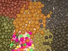 Boilies: carp bait made from a boiled paste are used in American and European carp angling. Boilies can be brightly colored or more natural in appearance. Boilies are made from milk proteins, eggs and artificial flavors, these are then boiled in water hence the name boilies. Pack bait, an American variation of the European Method Mix, utilizes a Binder and a Breaker to bind a ball of bait together and then cause it to break open once it is cast to its desired location. Tiger nuts are also commonly used as a hook or hair rig bait as well as Sweet Corn, Boiled Field, canned meat, worms, and peanuts (which have been banned in some European swims). In South Africa the most popular form of carp fishing is using a "mielie bomb", it is a spring shaped frame with crushed corn and maize pressed onto it. Baiting is often performed using baiting tools to increase accuracy and range.[3]