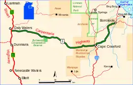 The Carpentaria Highway is a 380-kilometre-long (240 mi)[1] highway, which runs from near Daly Waters to Borroloola in the Northern Territory, Australia.[2] It is a sealed road and is part of National Highway 1.[3] The Highway takes its name from the Gulf of Carpentaria, which it links with the Stuart Highway. The Carpentaria Highway also provides road access to the McArthur River mineral deposits and port facilities at Bing Bong, as well as the isolated community of Borroloola and the popular fishing location at King Ash Bay. Funding for maintenance is provided by the Northern Territory government.[4]
