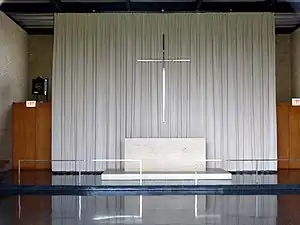 Bishop Conkling allegedly wanted to increase the presence of the Episcopal Church on campus by creating a place where students could engage deeper in faith.[4] Despite Conkling's apparent intention and church sponsorship, the final design did not include a parish house for the chaplain. Instead, Mies designed a modest yellow-brick prism whose only decorative features are the white, silk curtain behind the steel cross and the unadorned Roman travertine altar below it. Mies' simple plan for the small chapel was apparently intended to be conducive to inward contemplation. Interestingly, the university's desire to make a nondenominational structure may have caused the funding cuts. In fact, the administration later ensured that the building was open to students of all faiths. People currently use the chapel for both secular and nonsecular events such as Sunday services and weddings.[4]