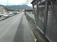 The simple station Carrera 43 is part of the TransMilenio mass-transit system of Bogotá, Colombia, which opened in the year 2000.