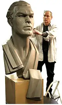 A slightly exaggerated belly, a few more wrinkles on the face, the nose a bit longer: all this together has an amazing effect. In the end the bronze image is a better likeness than the original.[5] Art critics call Eggers' works "whole-body portraits". Art historian Hanns Theodor Flemming (who died in 2005) stated: "Carsten Eggers Plastiken sind das Ergebnis künstlerischer Gestaltung, die jeder herkömmlichen Gegenständlichkeit trotzen und durch Lebendigkeit aufmerksam machen. Seine Stärke ist es, die menschlichen Stärken und Schwächen einzufangen. Ein Künstler, der völlig losgelöst von jeweiligen Trends seinen Weg geht." [Carsten Eggers' sculptures are the result of an artistic composition that means they defy conventional realism and attract attention by their vibrancy. His forte is capturing human strength and weakness. An artist who goes his own way without regard to the current trends.][6] The artist sees his work as memorials of serenity running counter to the short-termism and hectic pace of today's life and thus representing an opposing pole to them.