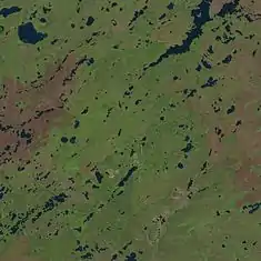 ![]() In the northern part the rim is visible as a series of low hills, in the southern part it is indicated by the course of Douglas River. Carswell Lake (in the upper right) cuts into the crater. | |