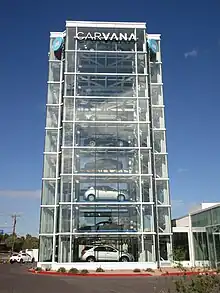 Carvana Co. is an online used car retailer based in Tempe, Arizona.[2] The company was the fastest growing online used car dealer in the United States and is known for its multi-story glass tower car vending machines.[3][4][5] Carvana was named to the 2021 Fortune 500 list, one of the youngest companies to be added to the list.[6]