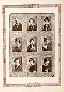 In 1915, the Chsite yearbook premiered.[7] In 1919, students organized a student council, a general athletic association, and The Echo campus newspaper.[8][9] In 1921, a marching band was formed, and school colors of olive green and white were selected, along with the white rose as the school flower.[10] The school motto was "service".[10]