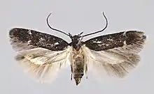 The length of the forewings is 5–6 mm. The forewings are blackish, with scattered white and brown scales particularly along the dorsal margin and across the first quarter and middle.[4] Adults have been recorded on wing from late June to late September.