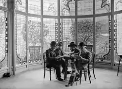 Interior of Casa Lleó Morera's covered gallery (1st floor), stained glass by Antoni Rigalt i Blanch; photo taken by Baldomer Gili i Roig (2nd from the right)
