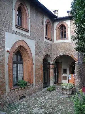 The Eustachi house is located in the ancient district of Porta Calcinara, near the Ticino bank. The Eustachi family, of popular origin and dedicated to river traffic, during the fourteenth century became, working for the Visconti, one of the main city families, so much so that Pasino Eustachi became, under Gian Galeazzo and then of Filippo Maria, captain of the Visconti fleet and defeated the Venetian fleet on the Po in the important battle of Cremona in 1431.[1][2] The house dates back to the early 15th century and is built around a small internal courtyard. Today, two "L" -shaped buildings remain of the structure, but it is assumed that it was much larger.[3] Casa Eustachi now houses the University of the Third Age.[4]