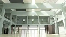 The second floor follows the distribution system of the first floor: the only difference is that gallery overlooks the roof of the Salone delle Adunate on which the inner courtyard opens.[40] This is characterized by the alternation of walls covered with glass-ceramic tiles (south-east and north-west sides) and walls made of concrete-frame glass blocks (south-west and north-east sides).[41] The roof of the Salone delle Adunate, which is the floor of the inner courtyard, consists of three parts: two lateral parts in concrete-frame glass block and the central walkway.[40] From the internal gallery on the second floor one can access the rooms that were originally used for offices and administration.[42]