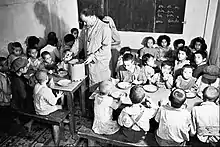 Following Dr. Schmidt's recommendations, the second project was to feed children without meat[46] but with dairy, fish and eggs products; The SP was selected by the OSE and the JOINT as a pilot project to prove the effectiveness of the diet. The program was launched in March 1956[47] and improvements were noticed within 6 months. School doctors found that children (all below eight years old) were in better health than the control group who had not benefited from the diet. They had gained more weight, grew faster, had better hemoglobin levels, had no vitamin deficiency and looked in a better shape.[23][48] This plan was later extended to other children's institutions, but this extension required staff training, which required time and additional investments. In 1959, however, a report noted that the diet was deficient in animal protein: ‘The deficiency in animal protein is mainly due to a lack of milk and cheese in the food ration’.[49] In 1960, a report noted that the effect of the JOINT action is visible in the well-being of children[50]