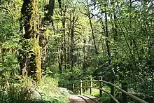 A forest canopy of Douglas-Fir, cedar and hemlock shades the ground, encouraging the growth of ferns, mosses and mushroom species. Wildflowers include Oregon trout lily, fairy slipper, western trillium, camas, fawn lily, Hooker's fairy bells, snow queen, false Solomon's-seal, stream violet, Oregon Iris and Pacific bleeding heart.[2]