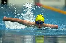 ![]() Action shot of Redford swimming in the 200 m medley SM9 at the 2000 Summer Paralympics | ||||||||||||