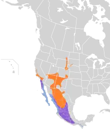 These birds migrate to their winter quarters between Southern California and northern Central America. They are permanent residents in south-central Mexico, and their main wintering ranges are west of the Gulf of California on Baja California Sur, and east of the sea on the mainland of western Mexico.