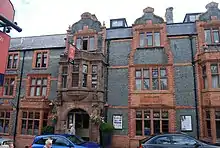 Seen from High Street, the hotel is in three sections, each of which has three storeys. To the left is a single-bay section, the former public house; the central section, developed from the older hotel, has four bays; and the section to the right, added in 1885, has three bays. The whole building is in Renaissance style.[1] When Douglas and Fordham remodelled the building, they used small broken pieces of limestone as a facing material, giving the frontage a flint-like appearance. The dressings of the windows are in brick and terracotta.[3] The central bay is in red ashlar sandstone and the roof is tiled.[1]
