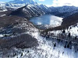 The lake filled rapidly during the winter of 1980–1981, and was expected to overflow the blockage in the fall of 1982.[3] However, a subsequent study predicted an earlier overflow, so in October 1981 a spillway 270 meters (890 ft) long and 30 meters (98 ft) wide was constructed to prevent the lake from flowing over the blockage, while at the same time the lake was cleared of the numerous downed trees that were blown into the lake by the eruption explosion.[3][5] In 1991, rainbow trout appeared in the lake, apparently resulting from the migration of stock introduced to Coldwater Lake a few years earlier.[2][4] The trout of Castle Lake are a self-perpetuating population, successfully spawning in the streams that feed Castle Lake.[4]