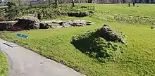 Very little of Bristol Castle remains above ground. The most tangible survival is a vaulted chamber of the King's Hall, formerly on Tower Street near the now-truncated Castle Street.[34] Other than that, the excavated remains of the south wall can be seen near the landing stage, and near St Peter's Church the sally port and traces of the west wall are visible.[35] The foundations of the keep are on show next to the public toilets on Newgate.[36]