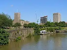 In 2006, Bristol City Council announced its intention to redevelop the area to the west of Castle Park, known as the 'Mary-le-Port' site. These plans encompassed the by then derelict financial buildings, and the area to the west of St Peter's Church, about 5% of the park.[26] It was to be a 400,000 square feet (37,000 m2) mixed-use development to 'regenerate this historic heart of Bristol'[27] and to 'improve connections between Broadmead, the Old City and Redcliffe' and 'enhance the setting of St Mary-le-Port church'.[28] The council selected Deeley Freed as its preferred developer. The scheme provoked opposition from park users who felt that any reduction in the area of the park was not acceptable. 'Surprised by the extent of feeling', Bristol City Council decided to revise the plans.[28] Campaigners then applied to have 'Town Green' status applied to the park, but this was declined in 2009.[29]