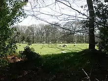 The fort measures 320 by 200 metres (1,050 by 660 ft) (NS by EW), enclosing an area of 5.2 hectares (12.8 acres).[1] There is a counter-scarp bank that averages 5 metres (16 ft) wide and varies in height from 3.1 metres (10 ft) at the southwest to between 0.8 and 1.5 metres (2.6 and 4.9 ft) at the northeast; at the southwest this bank is high enough to give the impression of a bivallate fort. There are four gaps in the ramparts, one in each of the cardinal directions, but it is not known if these were original entrances to the fort. The east and west gaps are suspected of being the original entrances while the narrower gaps on the north and south sides are thought to be modern field entrances.[5] The roughly oval rampart of the fort is overgrown with trees and bushes.[5] The interior of Castle Rings is flat and used for pasture; there is no visible evidence of Iron Age occupation.[5]