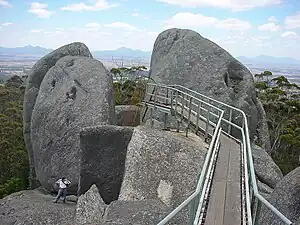 There is a walk trail to the summit which offers 360 degree views, 570 metres (1,870 ft) above sea level from a lookout known as the Granite Skywalk. The walk also takes in the unusual 'Balancing Rock', a 6-metre-high (20 ft) granite boulder which reportedly weighs around 186 tonnes (410 thousand pounds) yet rests on a base just 1.21 square metres (13.02 sq ft).[1]