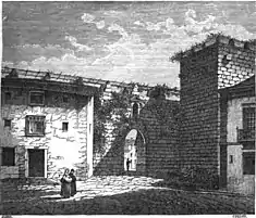 From the 13th century, the city walls had an approximately circular plan. A combination of archaeological evidence and documents allows for the walls' general lines to be reconstructed, but the exact location of the gates (of which there were at least four) and the towers are unknown.[1][2] Beginning at the Arco da Porta Nova (an 18th-century construction that replaced one of the older gates), the wall followed north-northeast along the Rua dos Biscainhos (its northernmost extent being the Campo da Vinha) and looped around southeast along the Rua dos Capelistas, touching the castle wall. After which, the walls continued southwest and then south, northwest and again north, passing through the Campo e Torre de São Tiago, the Largo das Carvalheiras, and the Largo de São Miguel-o-Anjo, before returning to the Arco da Porta Nova.[1]