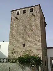 Of the old castle only the keep tower (Portuguese: Torre de Menagem) remains, consisting of a rectangular footprint and vertical block covered in tile.[1] The facades are built in granite masonry that is slightly staggered closer to the ground. The design is trimmed with chamfered merlons, battlements with gargoyles and machicolations to the corners.[1] It is four stories, or approximately 30 metres (98 ft) in height, with the first floor considerably taller than the remaining: it is about 12 metres (39 ft)tall.[1] This section is marked by grooves where other buildings abutted the structure, some stones with identifiable inscriptions.[1]