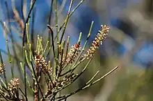 Casuarina cristata was first formally described in 1848 by Dutch botanist Friedrich Anton Wilhelm Miquel in his book Revisio critica Casuarinarum from specimens collected by Allan Cunningham near the Lachlan River.[6] The specific epithet (cristata) means "crested", possibly referring to the long, pointed bracteoles on the cones.[4] The tree is called muurrgu or murrgu in the Yuwaalaraay dialect of the Gamilaraay language around Walgett in northwestern New South Wales.[2] Other common names include scaly-barked casuarina, scrub she-oak, billa, ngaree, bulloak and swamp oak.[5]
