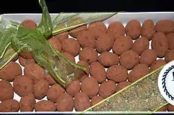 Catànies (Catalan pronunciation: [kəˈtaniəs], singular: catània) is a chocolate sweet typical of Vilafranca del Penedès and some other near towns made with marcona almonds. They are toasted and covered first by caramel and then by a thick layer of white chocolate or a mixture of almond, hazelnut and milk. Finally, they are covered by a thin layer of powdered black chocolate, sometimes mixed with a little bit of icing sugar.[1] They are often offered as a gift or served alongside coffee after a meal.