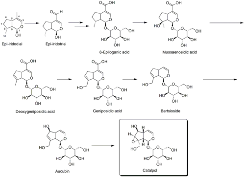 - 1 2 Damtoft, S. (1994). "Biosynthesis of Catalpol". Phytochemistry. 35 (5): 1187–9. Bibcode:1994PChem..35.1187D. doi:10.1016/S0031-9422(00)94819-2.