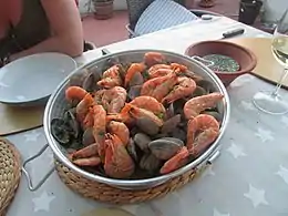 A cataplana is an item of cookware used to prepare Portuguese seafood dishes, popular in the country's Algarve region.[1] The cataplana is also the name of a typical dish of Algarve region as well as a Portuguese item of cookware used to make the dish and a method of cooking using it. The cooking vessel can be used for cooking a wide variety of ingredients, but prawns, clams and pork cataplanas are the most popular menus of the cataplana dish. According to The Oxford Companion to Food, the most famous dish made in a cataplana is amêijoas na cataplana (clams in cataplana).[2] The cataplana is traditionally made of copper and shaped like two clamshells hinged at one end and able to be sealed using a clamp on each side of the assembly, enabling the vessel to function as a crude pressure cooker. Cataplanas can also be made of aluminium.[2]