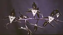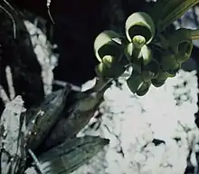 It has oblong-fusiform stems (pseudobulbs) carrying deciduous, ridged, many nerved, oblong-lanceolate, acute leaves. The leaves 4–5. Inflorescence arching to horizontal, 8-10 flowered.[1] Male flowers resupinate, triangular. sepals and petals are lanceolate, dark green marked with maroon. lip also triangular, white. Female flowers green. sepals and petals recurved.