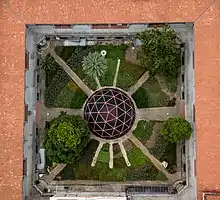 The outside of the museum also has numerous objects on display. There are replicas of carriages, parts of old mills, train wagons, locomotives and an old airplane. In addition, some war pieces such as anti-aircraft artillery cannons are on display.[4] There is a large fountain with live fish, a butterfly garden and many trees. At the front entrance of the museum there is a granite sphere.[3]