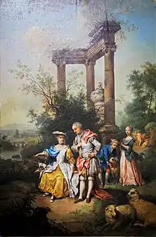 Catharina Elisabeth was born to Johann Wolfgang Textor (1693–1771) and Anna Margaretha Lindheimer (1711–1783) on 19 February 1731.[1] Johann Wolfgang was a wealthy lawyer involved with Frankfurt politics.[2] She married Johann Caspar Goethe, on 20 August 1748,[3][4] after which she moved into his house on Großer Hirschgraben.[5] Three months later, she became pregnant aged 18,[6] and her son Johann Wolfgang was born at the house on 28 August 1749.[7][8] Goethe was soon pregnant again, and gave birth to her second child, Cornelia, on 7 December 1750.[9] 5 more children followed, but none survived to adulthood.[10] After the death of Georg Adolf in 1761, the Goethes did not try for any more children; each birth posed a great risk to both the mother and child.[11] Catharina Elisabeth's role in the Goethe household primarily involved looking after her children; the Goethes had a servant, a cook and two maids who did most of the household tasks.[12]