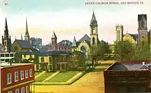 St. Paul's had its beginnings on October 15, 1854, when the first service was held at Fort Des Moines for ten communicants.[3] A brick and frame church building was completed in 1857 on Seventh Street between Locust and Walnut Streets. Before its completion, services were held in the old Polk County Courthouse.[1] By 1870 the congregation decided to replace its church building and purchased the current site. It would be another 13 years before construction began on the new church.